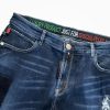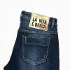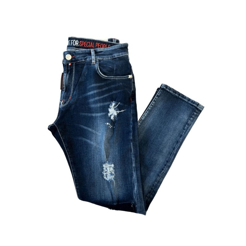 Confeccionada em jeans stretch, lavagem média e rasgos frontais.