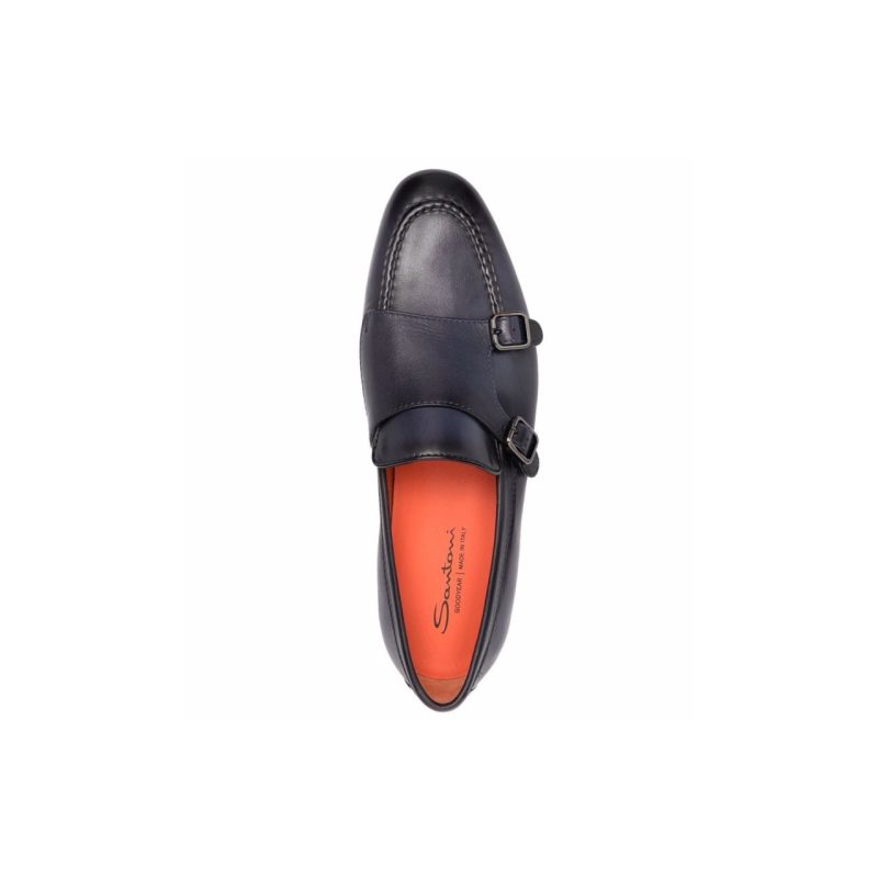 Sapato Mocassim com fivela lateral em couro azul marinho, Santoni. Com estilo slip-on, fecho por fivela, frente arredondada, sola com logo.
