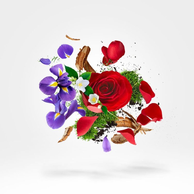 . Coração de Patchouli, Jasmim Sambac Indiano, Íris Florentina, Rosa Búlgara.